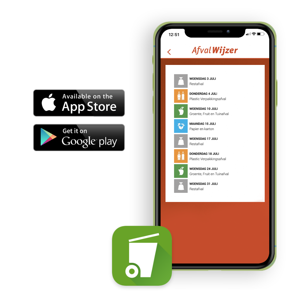 Met de app Mijn Afvalwijzer ben je altijd op de hoogte wanneer jouw afval wordt opgehaald. Je kunt deze downloaden op je telefoon of inloggen via mijnafvalwijzer.nl